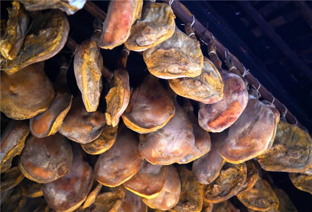 殺完豬后,諾鄧人都會把最好的豬后腿留著腌制火腿,搭配諾鄧千年古井礦物質井鹽,進行純手工腌制。隨著時間的發酵,通風晾干,制作好的諾鄧火腿色澤紅潤,香味濃郁,咸鮮帶甜,肥而不膩,滿口余香,回味悠長。